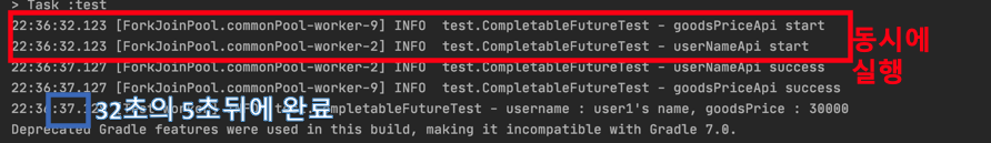 그리고 각 CompletableFuture에 get()을 실행하게 되면 블록킹이 일어나서 완료될때까지 대기하게 됩니다.