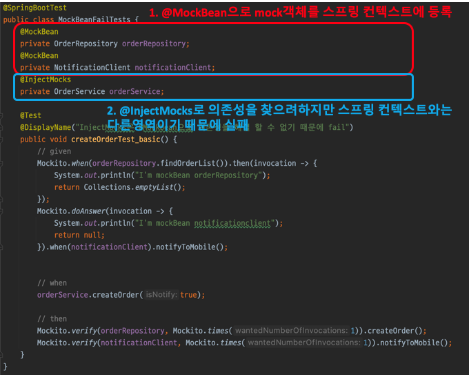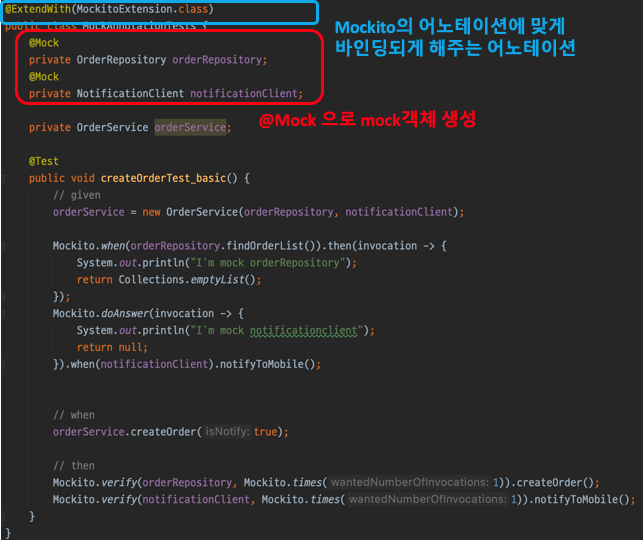 - 기존 실제 OrderRepository와 NotificationClient를 생성해서 의존성을 해결했던것과는 달리 mock객체를 생성하여 의존성을 해결합니다.