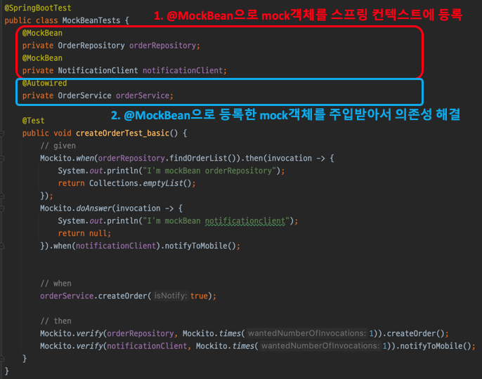 - @MockBean은 mock 객체를 스프링 컨텍스트에 등록하는 것이기 때문에 @SpringBootTest를 통해서 Autowired에 의존성이 주입되게 됩니다.