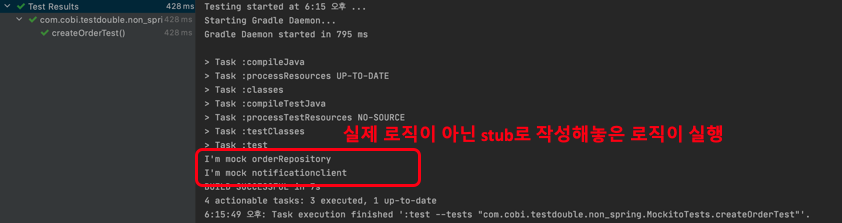 위 결과를 보면 실제 OrderRepository와 NotificationClient의 로직이 아닌 stub로 작성해놓은 로직이 실행된것을 확인 할 수 있습니다.