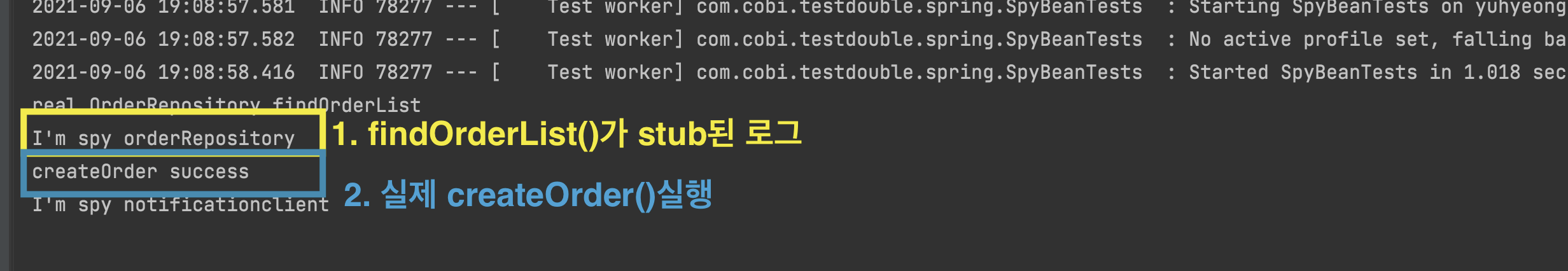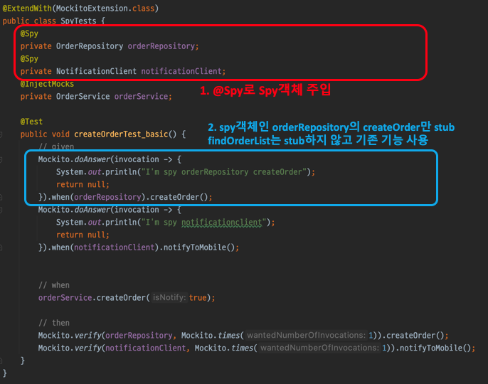 - spy객체인 orderRepository에서 createOrder()만 stub하고 findOrderList()는 기존 기능 사용하도록 상황 설정