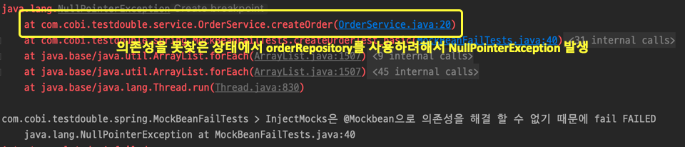 아래 예제는 위 예제에서 @InjectMocks(실패)으로 변경했을때 실패하는 예제를 따로 구현한 형태입니다.