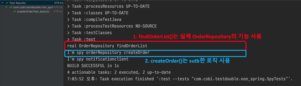 아래 예시는 OrderRepository.createOrder()는 sutb하고 OrderRepository.findOrderList()는 그대로 기존 기능을 사용하도록 구현된 테스트입니다.