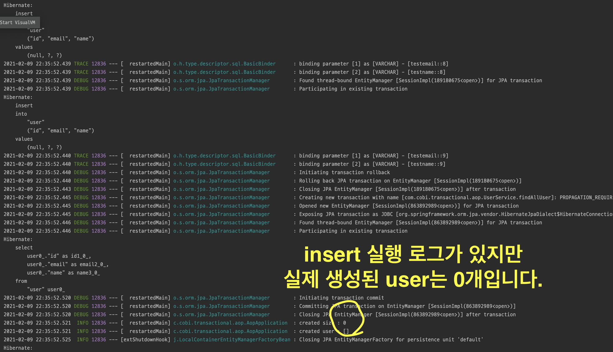 createUser에 @Transaction이 걸려있어 각각 commit이 될거라 예상했지만 실제 생성된 User는 0개이며 transaction이 rollback된듯한 결과가 나왔습니다.