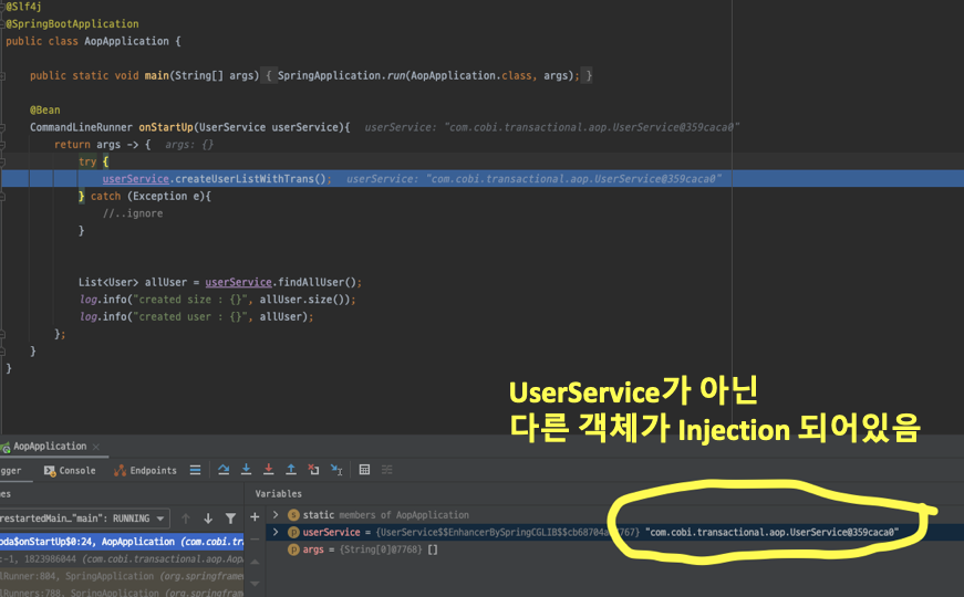 아래 AopApplication.java(링크)를 24번째 줄(userService.createUserListWithTrans)에 breakpoint를 걸어보면 바로 확인할 수 있습니다.