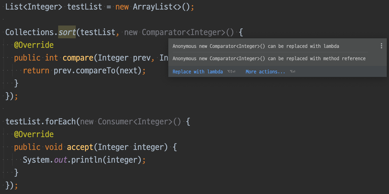 IntelliJ가 지원하는 익명 클래스 → Labmda 의 변환